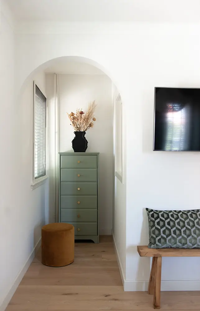 Deze prachtige slaapkamer is onderdeel van de jaren ‘30 woning in ‘s-Hertogenbosch. De slaapkamer was nog helemaal wit toen ik hier voor het eerst kwam. Het miste intimiteit en sfeer. De prachtige groene tint zorgt voor een kalmerende, maar toch warme sfeer waar je graag na een drukke dag heerlijk in slaap valt. De ladekast in de nis hebben we dezelfde kleur gegeven om het geheel helemaal af te maken. Wil jij na een drukke werkdag ook heerlijk ontspannen in een sfeervolle slaapkamer in slaap vallen? Ik help je graag.